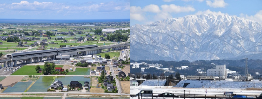 ◆北陸新幹線黒部宇奈月温泉駅(東京から2時間半)/黒部市内から望む雪の立山連峰